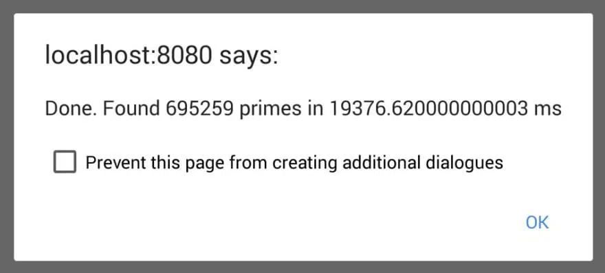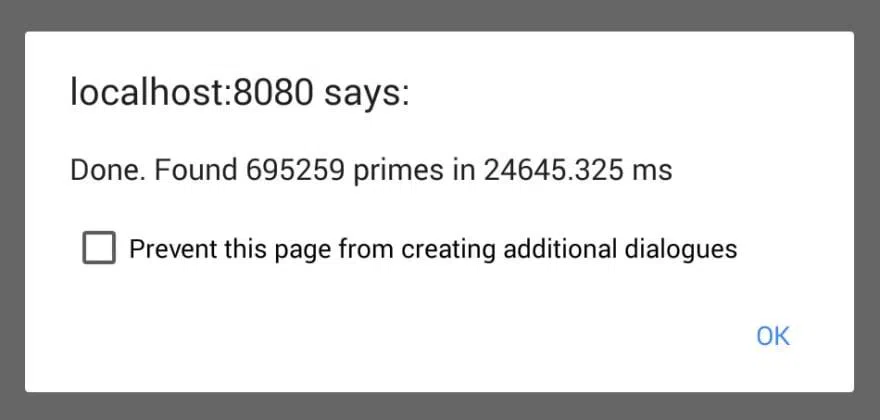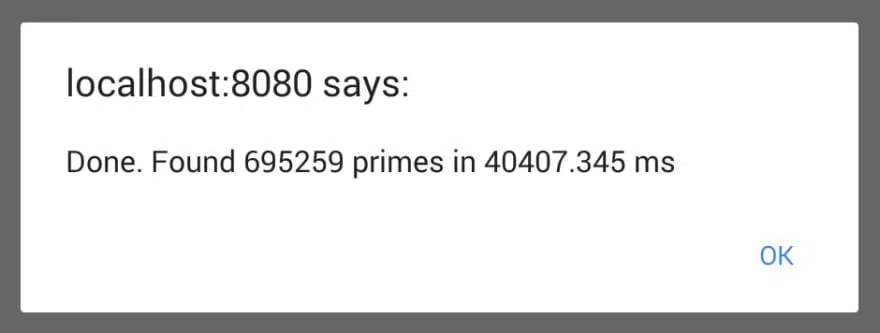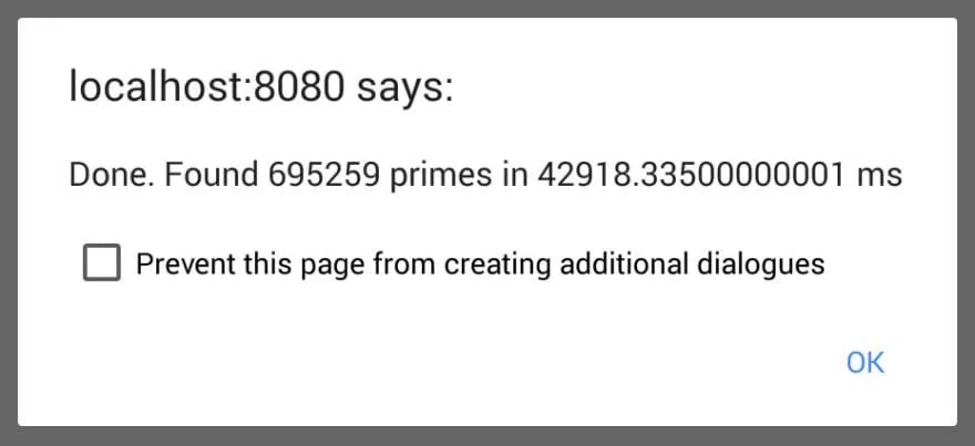alert(`Done. Found ${msg.data.numPrimes} primes in ${timeTaken} ms`)