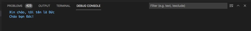fmt.Println("Xin chào, tôi tên là Đức")Hẳn bạn cũng đã hình dung ra console sẽ hiển thị: