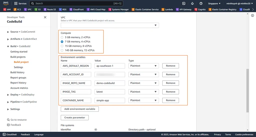 - Các bạn cấu hình tên các biến môi trường trong file buildspec.yml đã khai báo trước đó nhé. Phần compute các bạn có thể thay đổi, memory càng lớn thì tốc độ build code càng nhanh nhưng đồng nghĩa giá càng cao đấy nhé. Sau cùng là nhấn nút Update enviroment