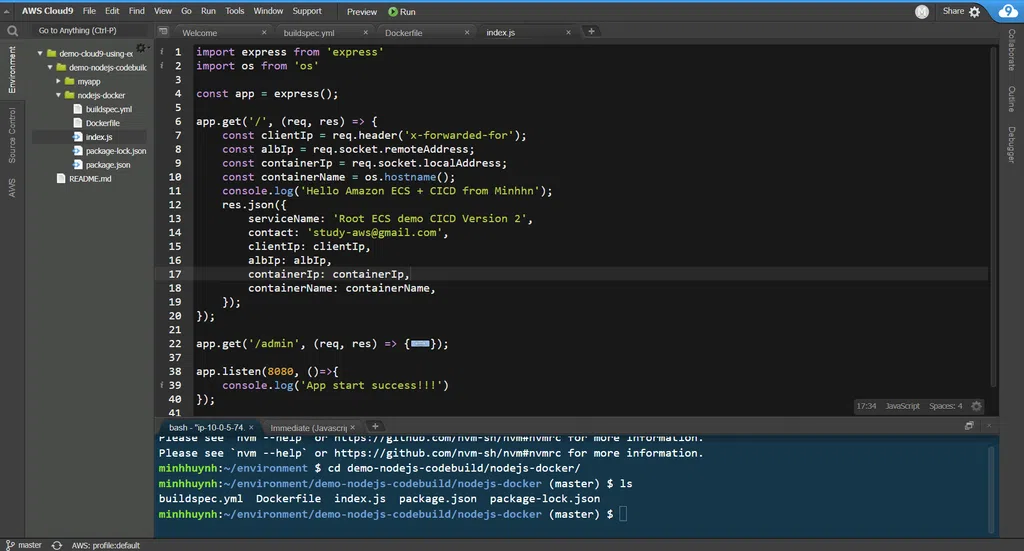 Ở đây mình đã tạo một project source code Nodejs, sử dụng framework Express chạy node version: 18.15.0, có một file index.js trả về thông tin json, mình chủ yếu sẽ tương tác thay đổi trên file này. Ứng dụng mình chạy cổng 8080 nhé. (sẽ mapping với Target Group khi tạo Application Load Balancer ở trên). Các bạn có thể clone project của mình tại đây