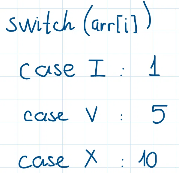 Lúc này chúng ta sẽ làm ngược lại với cách 1, duyệt các chữ số từ phải qua trái dãy số La Mã. Thay vì dùng HashMap như trên, ta sẽ dùng mệnh đề switch case để xét từng chữ số từ phải qua trái. Ta sẽ so sánh số hiện tại với số liền kề bên phải nó.