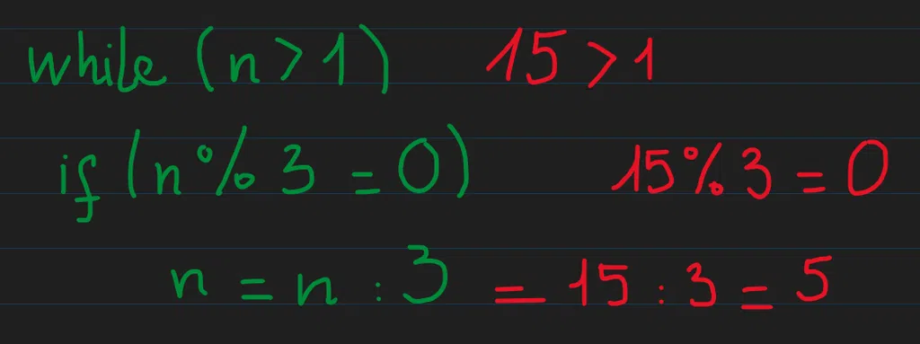 Như phân tích ở trên, ta sẽ phải làm một công việc lặp đi lặp lại, ấy là kiểm tra và chia n cho các thừa số nguyên tố 2, 3 và 5. Vậy thì ta sẽ làm một cái vòng lặp while() với điều kiện là n > 1, bởi vì nếu n là số xấu thì nó phải giảm về được 1, khi đó ta sẽ dừng vòng lặp.